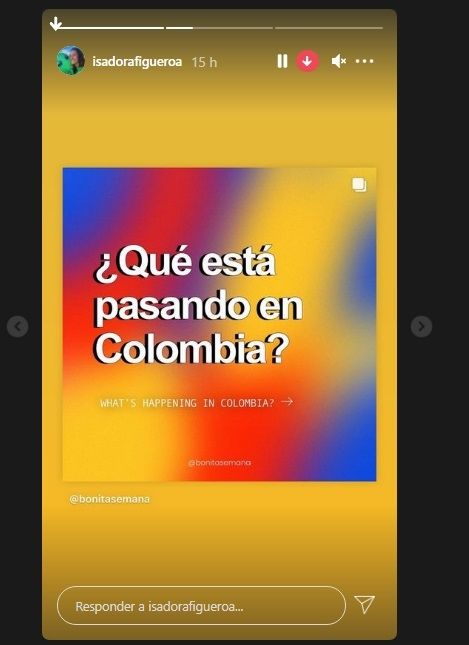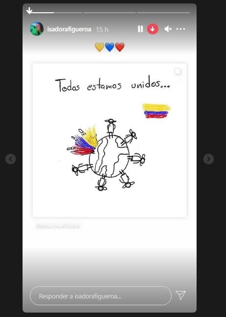 Hace algunas horas atrás, la bella morena compartió una serie de estados en su cuenta oficial de Instagram donde se la ve apoyando el pedido de justicia para todos lo ciudadanos de Colombia tras lo hechos de violencia que se presenciaron hace algunos días atrás. En una de las capturas se puede ver el mensaje: "Todos estamos unidos..."