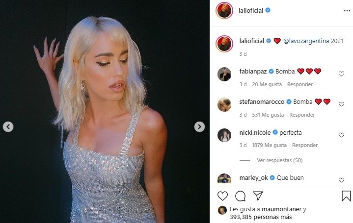 Esta vez no fue la excepción ya que hace recientemente, en su perfil de su cuenta oficial de Instagram, la talentosa argentina compartió una serie de fotos y videos que causó la reacción de miles de sus seguidores como así también de varios famosos. Entre ellos estaba nada menos el like de su compañero en La Voz e hijo de Ricardo Montaner, Mau Montaner. Además en dichas fotografías se puede ver a Lali lucir un vestido plateado que enalteció su gran figura.