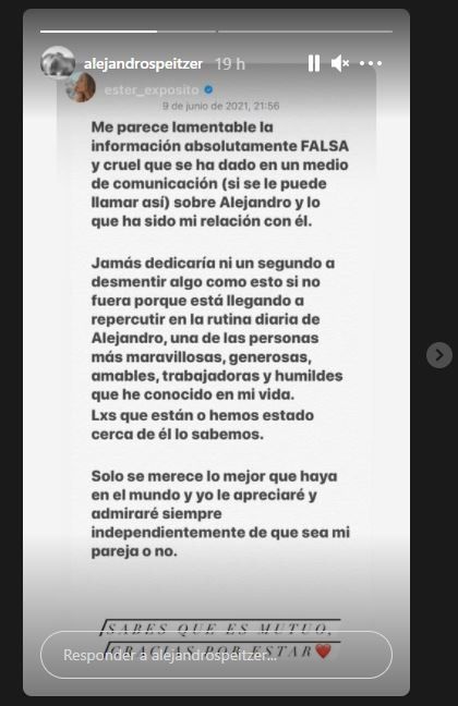Ante ello, Expósito compartió su descargo en su cuenta oficial de Instagram: “Me parece lamentable la información absolutamente FALSA Y cruel que ha dado en un medio de comunicación (si se puede llamar así) sobre Alejandro y lo que ha sido mi relación con él. Jamás dedicaría ni un segundo a desmentir algo como esto si no fuera porque está llegando a repercutir en la rutina diaria de Alejandro, una de las personas más maravillosas, generosas, amables, trabajadoras y humildes que he conocido en mi vida. Lxs que están o hemos estado cerca de él lo sabemos. Sólo se merece lo mejor que haya en el mundo y yo le apreciaré y admiraré siempre independientemente de que sea mi pareja o no”.