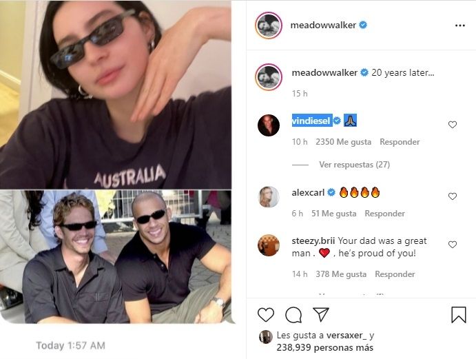 En tanto que en la jornada de ayer, Meadow, compartió una foto en su perfil de su cuenta oficial de Instagram donde se ve su padre, Paul Walker junto a su amigo Vin Diesel. Además en la misma también aparece ella luciendo unos anteojos similares a los de su padre y tío respectivamente. Asimismo en la descripción de la fotografía la bella modelo escribió la frase "20 years later..." En tanto que el protagonista de la película Rápidos y Furiosos le contestó "".