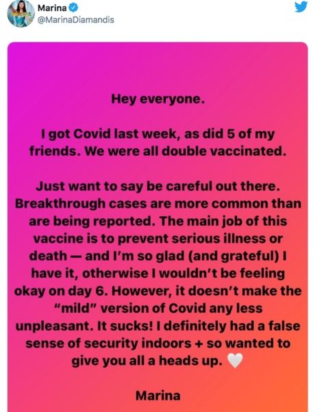 Marina Diamandis dio la confirmación de tener Coronavirus a través de Twitter el pasado lunes, a pesar de que su calendario de vacunación está completo con las dos dosis. La galesa dijo que cinco de sus amigas, también vacunadas de forma completa, contrajeron la enfermedad ese mismo día.