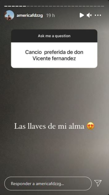 Una de las preguntas más destacadas que respondió América Fernández es cuál es la canción preferida de don Vicente Fernández. La azteca reveló que el tema musical preferido de su abuelo es “Las llaves de mi alma”. Otra interesante pregunta recibida por sus seguidores fue “¿Te da pena cantar? Cantas hermoso! Deberías de hacerlo más seguido por aquí” a lo que la hija de “El Potrillo” contestó: “Sii jajajajaja tengo pánico escénico severoo pero gracias”.