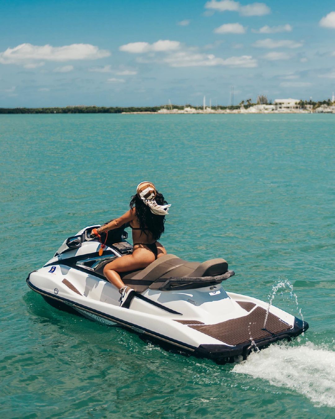 Asimismo, hace algunas horas atrás, en su cuenta oficial de la famosa red de la camarita, Becky G compartió un par de fotos de ella que demuestra lo hermosa que está a sus 24 años de edad. En ellas aparece luciendo un bikini de color negro que enalteció su figura arriba de una moto acuática. Además a dicha publicación le agregó el siguiente comentario: "Y te pone happy, cuando muerdes de esta fruta ??".