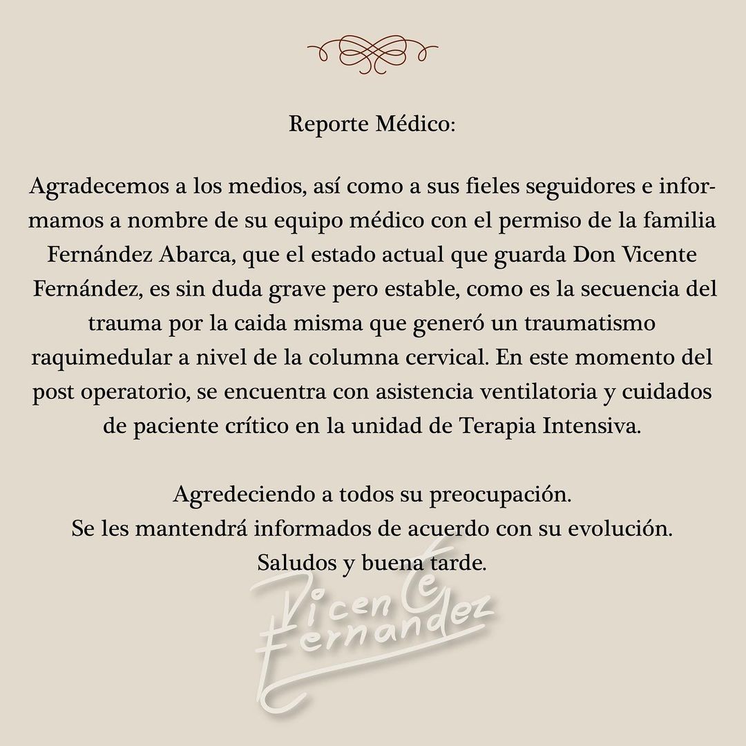 Por su parte, se conoció que esta estrepitosa caída ocurrió el pasado fin de semana en una de sus propiedades, puntualmente en la finca "Los tres potrillos". La familia Fernández lanzó un comunicado para llevarle tranquilidad a sus millones de seguidores. El mismo comenzó de la siguiente manera: "Agradecemos a los medios, así como a sus fieles seguidores e informamos a nombre de su equipo médico con el permiso de la familia Fernández Abarca, que el estado actual que guarda Don Vicente Fernández, es sin duda grave pero estable, como es la secuencia del trauma por la caída misma que generó un traumatismo raquimedular a nivel de la columna cervical".