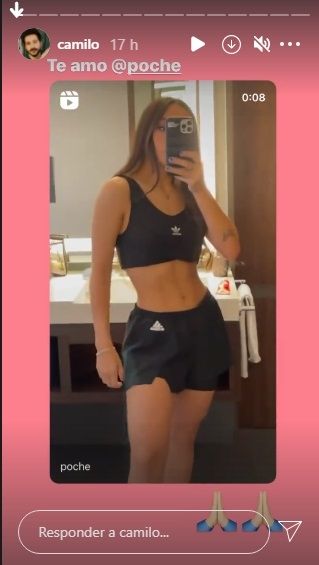 El video fue publicado por el intérprete de la canción "Ropa cara" hace algunas horas atrás. En dicho material audiovisual se puede ver a Poché presumir su gran figura. Allí la bellísima bailarina aparece con un conjunto que está compuesto por un top y minishort de color negro. Además a dicha historia, Camilo le agregó el siguiente mensaje: "Te amo @poche".