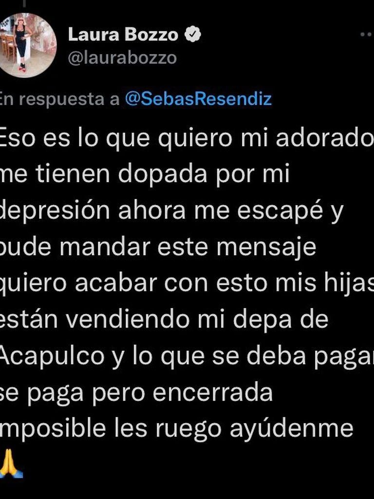 Estos fueron algunos de los mensajes que publicó Bozzo en su cuenta cuando estuvo supuestamente hackeada: “Siento no haber cumplido, entendí tenía tres años para hacerlo y si no me presente es por que por mis problemas de salud avalados por médicos era una sentencia de muerte anticipada. El SAT quiere que pague, como hacerlo encerrada? Lo que se deba se paga” y “Me tienen dopada por mi depresión, ahora me escapé y pude mandar este mensaje, quiero acabar con esto. Mis hijas están vendiendo mi depa de Acapulco y lo que se deba pagar se paga, pero encerrada imposible. Les ruego, ayúdenme”.
