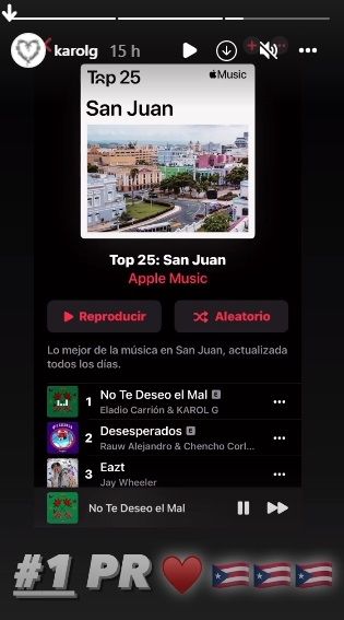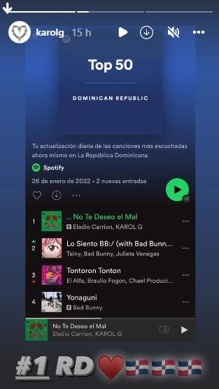 Esta vez no fue la excepción ya que hace algunas horas atrás, la preciosa colombiana compartió una serie de fotos en sus historias de su cuenta oficial de Instagram donde informó una feliz noticia para su carrera musical. La misma tiene que ver con que su colaboración en la canción "No te deseo el mal" que interpreta junto Eladio Carrión que llegó a ser el tema musical más escuchado en República Dominicana y Puerto Rico respectivamente.