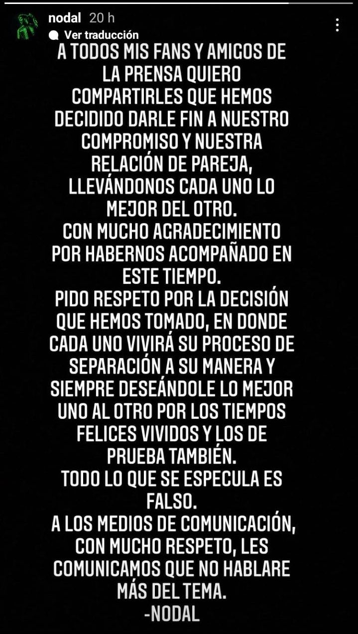 En ese momento, el cantante mexicano compartió un mensaje en su redes que decía: "A todos mis fans y amigos de la prensa quiero compartirles que hemos decidido darle fin a nuestro compromiso y nuestra relación de pareja, llevándonos cada uno lo mejor del otro. Con mucho agradecimiento por habernos acompañado en este tiempo. Pido respeto por la decisión que hemos tomado, en donde cada uno vivirá su proceso de separación a su manera y siempre deseándole lo mejor uno al otro por los tiempo felices vividos y los de prueba también. Todo lo que se especula es falso. A los medios de comunicación, con mucho respeto, les comunicamos que no hablaré más del tema".
