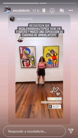 En uno de sus estados, la intérprete de la canción "Amor completo" compartió una fotografía de una de sus seguidoras dentro de la galería de arte Bahía Utópica que está ubicada en la ciudad de Valparaíso, Chile. Allí, durante este mes y en marzo, respectivamente, se está presentando una exposición de los cuadros de Mon Laferte.