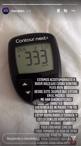 El diagnóstico de diabetes llegó el jueves, en una visita rutinaria al médico. A su regreso, el mediático compartió la noticia en las redes: "Estamos acostumbrados a subir solo las cosas bonitas. Pues bien, desde este jueves que estuve en el médico, me han diagnosticado diabetes (herencia de mi madre y mi tío Bernardo). Estoy asimilándolo todavía y estos son los números en ayunas. Toca cuidarse chicos, toca tomarse la vida de otra manera, toca echarle huevos y, sobre todo, toca vivir", dijo, acompañado por una foto de su aparato de medición de glucosa.