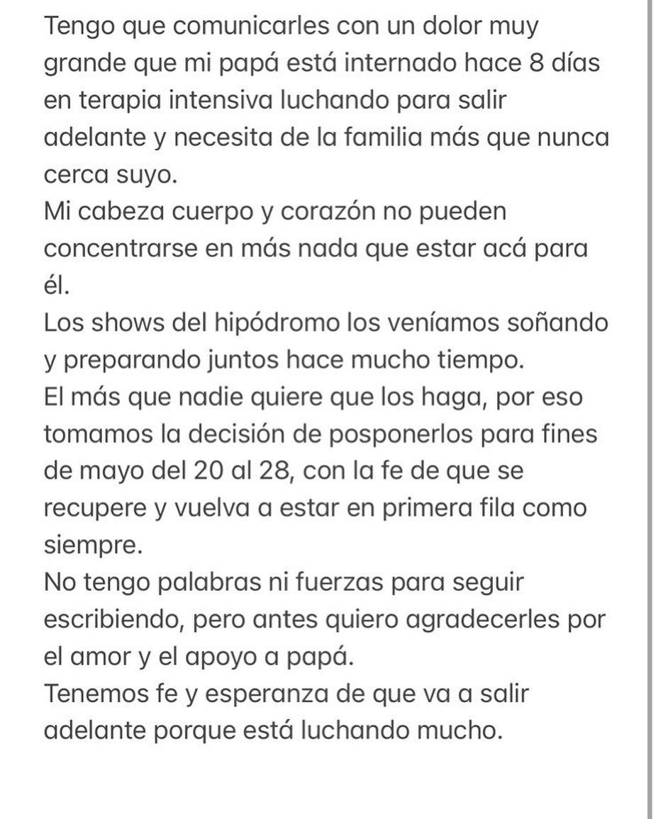 Hace unos días, la propia Tini Stoessel a través de sus cuentas oficiales, compartió un mensaje a todos sus seguidores donde habló de su familia y de qué pasará con las fechas que tenía pautadas para sus respectivos shows. El mensaje que fue compartido en su cuenta de Instagram decía lo siguiente: "Tengo que comunicarles con un dolor muy grande que mi papá está internado hace 8 días en terapia intensiva luchando para salir adelante y necesita de la familia más que nunca cerca suyo. Mi cabeza cuerpo y corazón no pueden concentrarse en más nada que estar acá para él. Los shows del hipódromo los veníamos soñando y preparando juntos hace mucho tiempo. El más que nadie quiere que los haga, por eso tomamos la decisión de posponerlos para fines de mayo del 20 al 28, con la fe de que se recupere y vuelva a estar en primera fila como siempre. No tengo palabras ni fuerzas para seguir escribiendo, pero antes quiero agradecerles por el amor y el apoyo a papá.Tenemos fe y esperanza de que va a salir adelante porque está luchando mucho".
