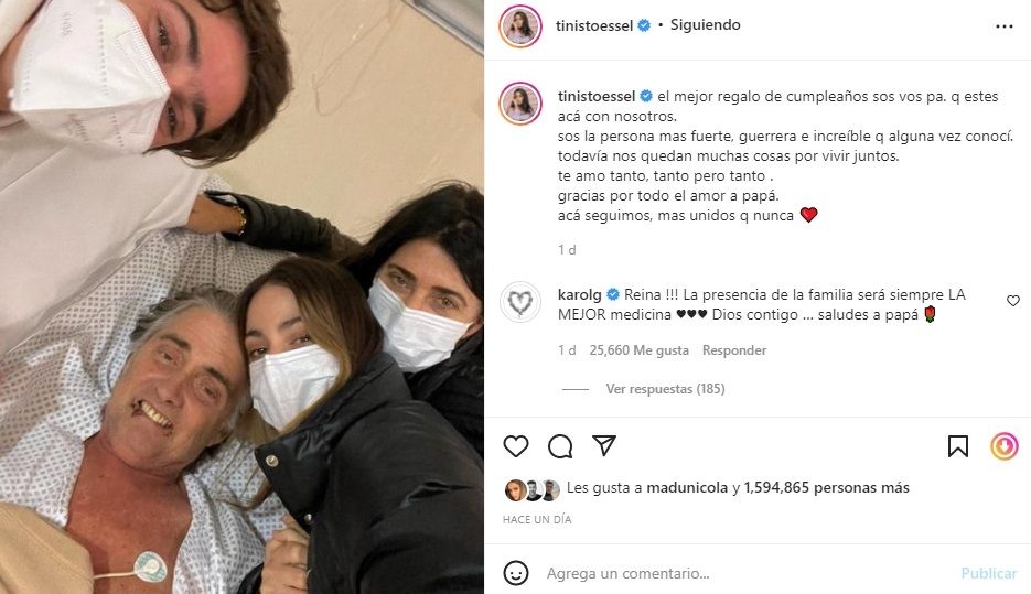 Ayer Tini compartió una foto junto su padre y sus hermanos en su perfil de su cuenta oficial de Instagram. El mismo tiene que ver con su cumpleaños y la salud de su padre. "El mejor regalo de cumpleaños sos vos pa, que estés acá con nosotros. Sos la persona más fuerte, guerrera e increíble que alguna vez conocí. Todavía nos quedan muchas cosas por vivir juntos. Te amo tanto, tanto pero tanto. Gracias por todo el amor a papá. Acá seguimos, más unidos que nunca".