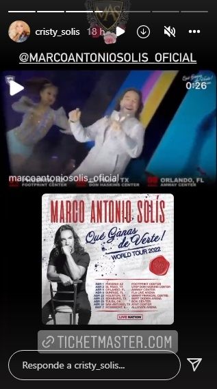 La madre de Marla y Alison, recientemente, aprovechó para comunicar las fechas donde se presentará su esposo Marco Antonio Solís en diversas ciudades de los Estados Unidos. Esta gira hasta el momento cuenta con nueve presentaciones confirmadas y la misma comienza el primero de abril en el Footprint Center de Phoenix, Arizona.