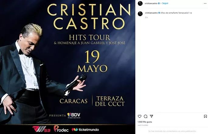 Según su reciente publicación en Instagram, Cristian Castro le rendirá un emotivo homenaje a Juan Gabriel y José José. Entre una extensa lista de estrellas internacionales que están en la cola para presentarse en Caracas, el cantante está feliz por volver a Venezuela. Incluso, escribió: “Años de extrañarte Venezuela!!!”