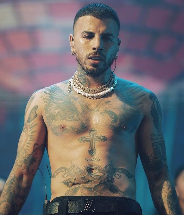 El puertorriqueño presumió de su nuevo tatuaje en una presentación que tuvo en San José, California, donde se sacó la remera y dejó ver el nombre de su pareja estampado sobre su piel. Se tatuó el nombre de Rosalía sobre su abdomen, debajo de una cruz. Pero no lo hizo con una tipografía cualquiera, el detalle es destacable, ya que lo hizo con la tipografía del último trabajo discográfico de la artista española.