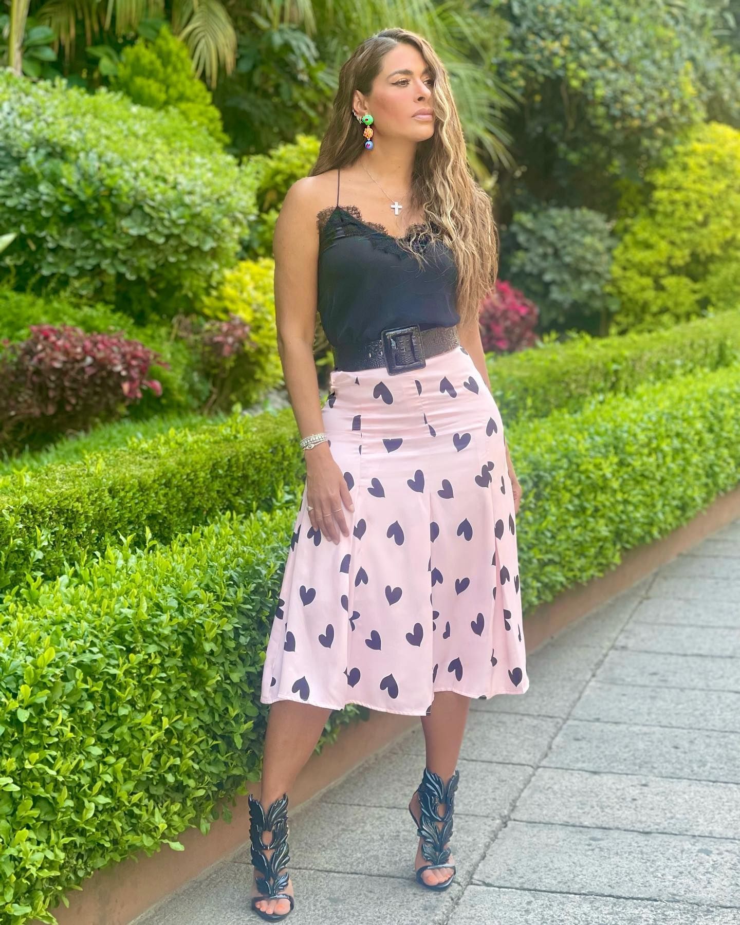 Hace algunas horas Galilea Montijo compartió una foto en su perfil de su cuenta oficial de Instagram que cautivó a sus fans. En la misma se puede ver a la mexicana luciendo un look que no solo enalteció su perfecta figura sino que también dejó en evidencia lo hermosa que está actualmente. Éste consistía en una blusa de color negro y una falda de tonos rosados con corazones del mismo color de la blusa.