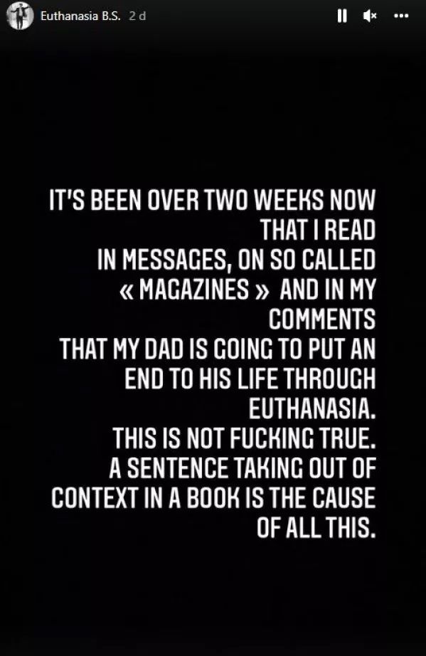 “Usualmente no hago esto, pero se está saliendo de las manos. Han sido dos semanas en las que he leído en mensajes y en las llamadas revistas, que mi papá va a ponerle fin a su vida a través de la eutanasia. Esa no es la maldita verdad. Una frase de un libro sacada de contexto es la causa de todo esto”, escribió en su cuenta oficial.
