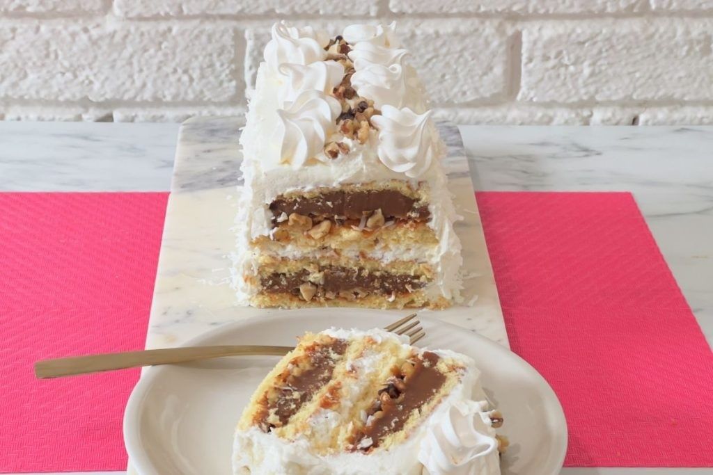 Paso 6: Forra un molde de pan con papel plástico dejando que sobresalga por los lados. Corta el bizcocho en 4 rectángulos del tamaño del molde. Coloca capas alternas en el molde en el siguiente orden: bizcocho (coco hacia abajo), dulce de leche, nueces molidas, bizcocho, crema montada, merengue triturado, bizcocho, dulce de leche, nueces y bizcocho. Cubre el molde con papel plástico y congela por 2 horas o refrigera toda la noche.