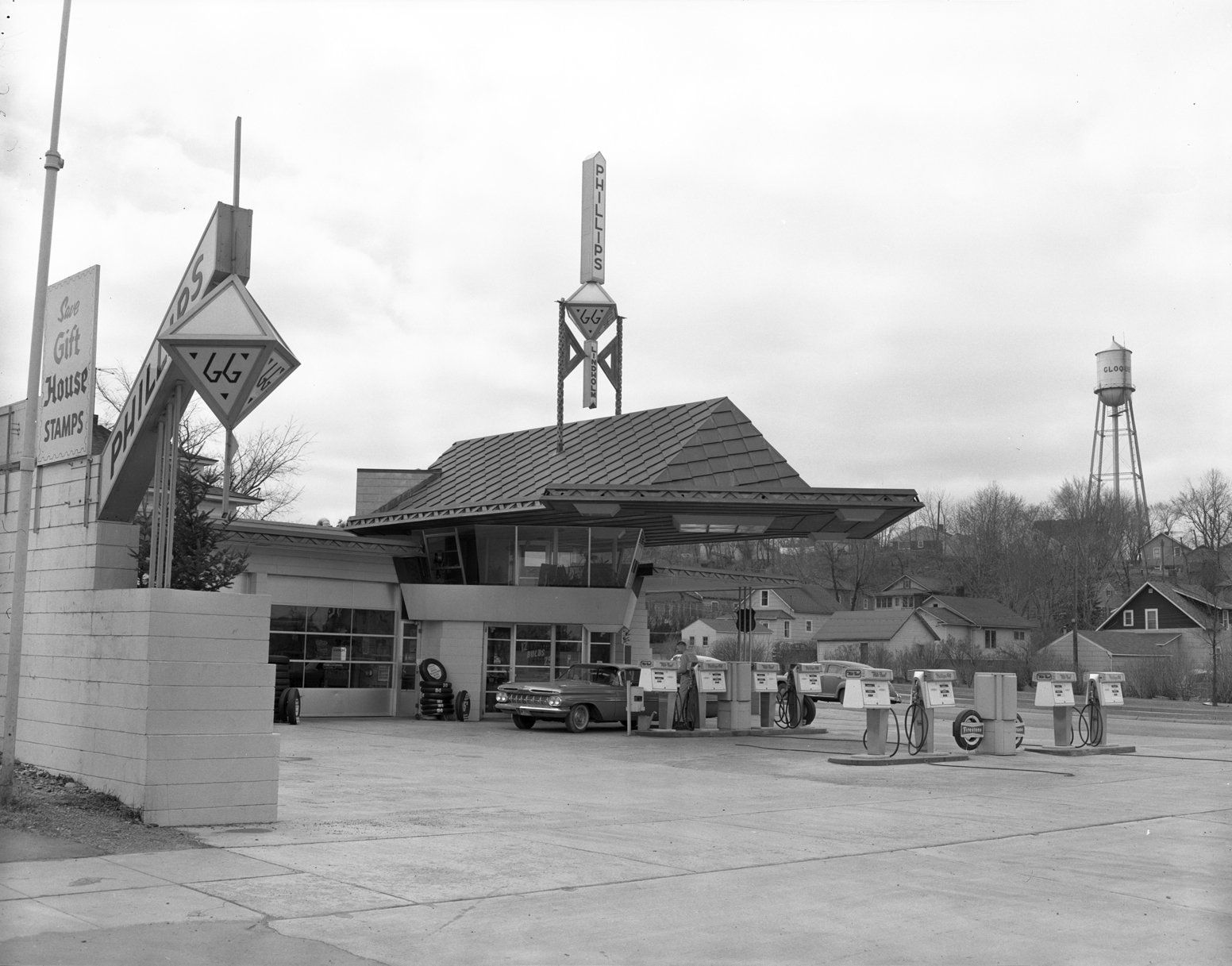 En la intersección de las avenidas Corrientes y Forest, en el barrio porteño de Chacarita, se construyó esta estación de servicio en 1951. En la foto se puede observar unas imponentes luces que realzan el cartel y el techo, que se podía disfrutar mejor de noche.
