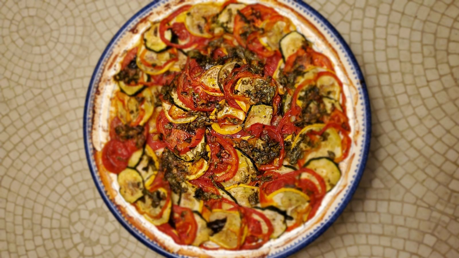 - Preparar el molde, colocar la salsa de tomate o tomates fritos y acomodar los vegetales en forma alternada.