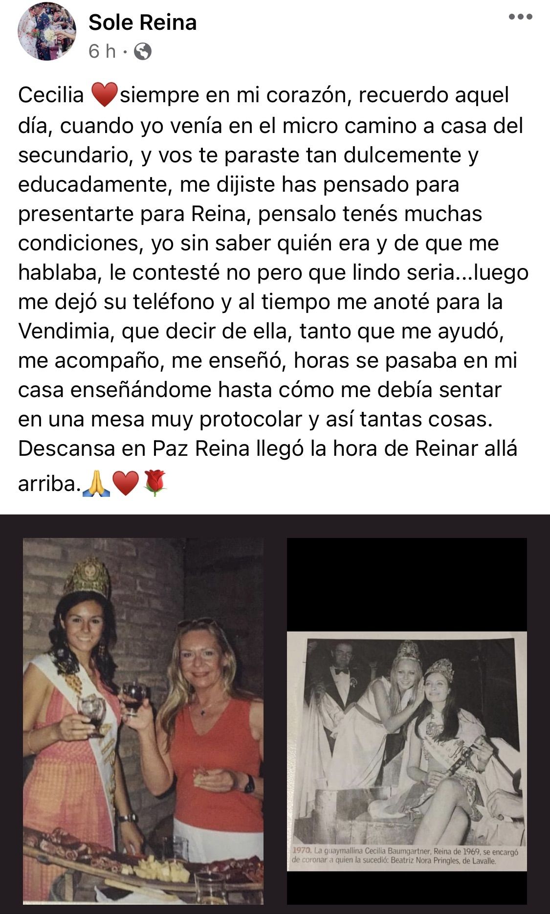 "Cecilia siempre en mi corazón, recuerdo aquel día, cuando yo venía en el micro camino a casa del secundario, y vos te paraste tan dulcemente y educadamente, me dijiste: 'Has pensado para presentarte para Reina, pensalo tenés muchas condiciones'. Yo sin saber quién era y de que me hablaba, le contesté 'no pero que lindo sería'... Luego me dejó su teléfono y al tiempo me anoté para la Vendimia, que decir de ella, tanto que me ayudó, me acompaño, me enseñó, horas se pasaba en mi casa enseñándome hasta cómo me debía sentar en una mesa muy protocolar y así tantas cosas. Descansa en Paz Reina llegó la hora de Reinar allá arriba", escribió Soledad Reina, presidenta de la Corenave -Comisión de Reinas Nacionales de mandato cumplido-.