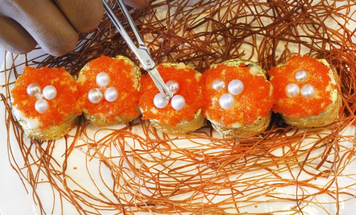 El sushi está envuelto en hojas de oro de 24 quilates y además está salpicado con diamantes de 0.20 quilates. Una receta inimaginable y muy costosa, el plato tiene un valor de 2000 dólares.