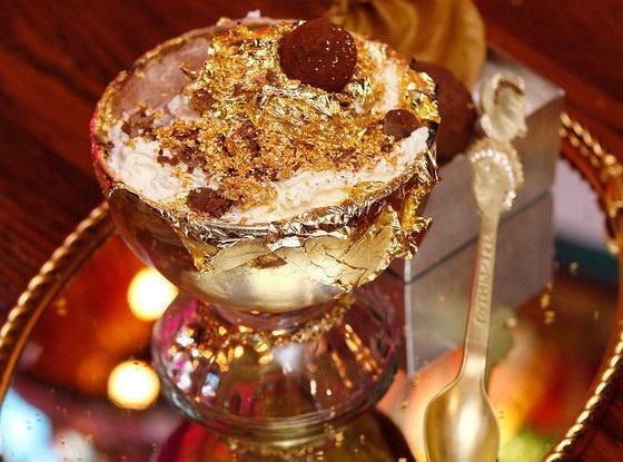 Este rico postre te lo sirven en la mesa con una cuchara de oro macizo con incrustaciones de diamantes negro, blancos y color chocolate. Su precio ronda los 25000 dólares.