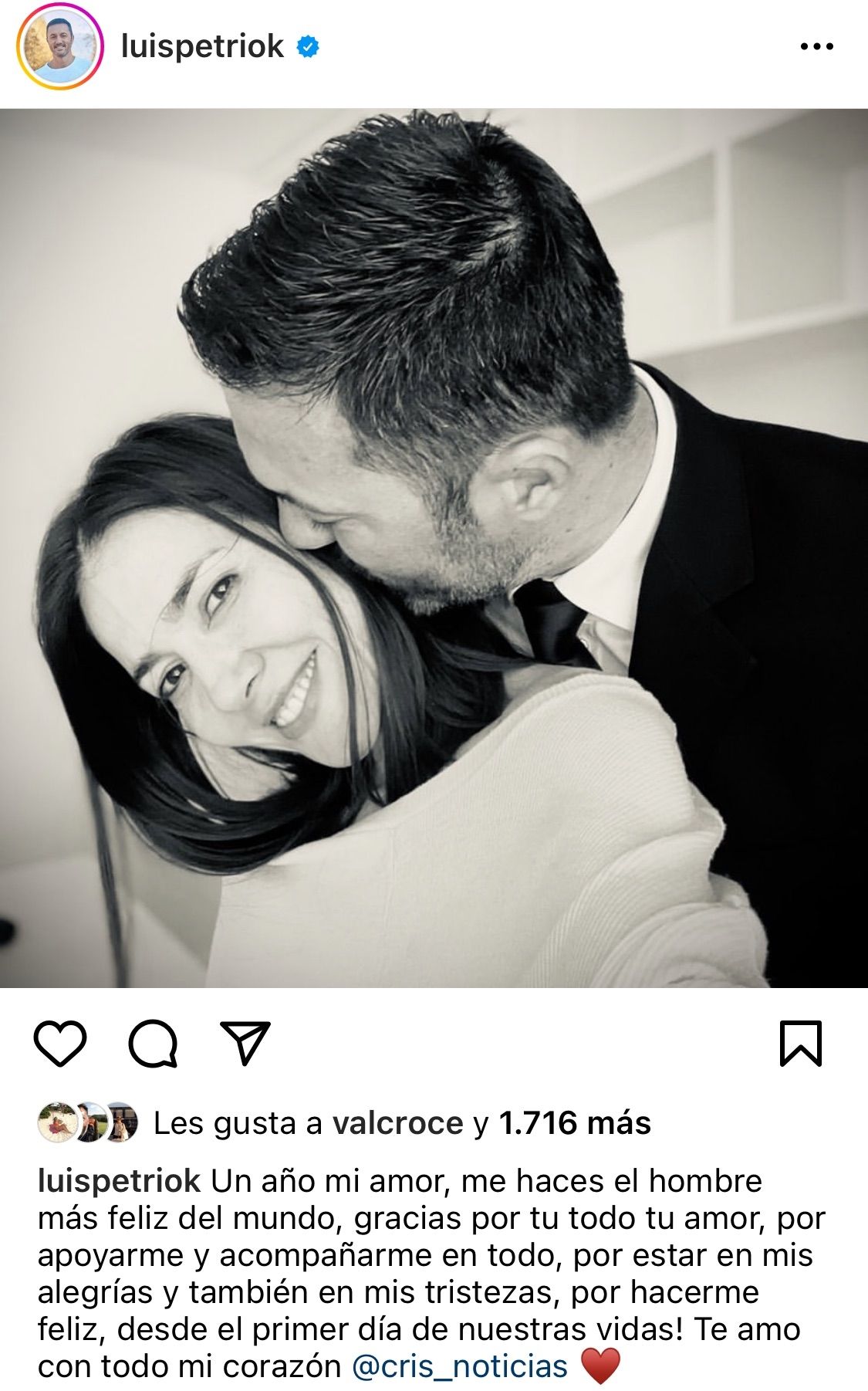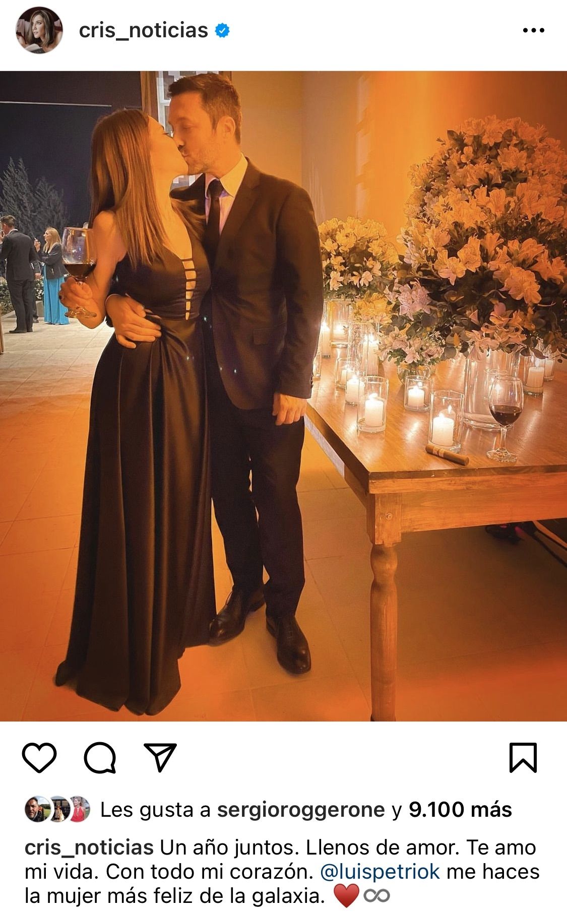 "Un año juntos. Llenos de amor. Te amo mi vida. Con todo mi corazón. @luispetriok me haces la mujer más feliz de la galaxia", escribió Cristina como epígrafe a una foto en donde ambos se besan y muestran evidentemente lo que es un íntimo festejo del aniversario, rodeados de velas y vestidos de gala..