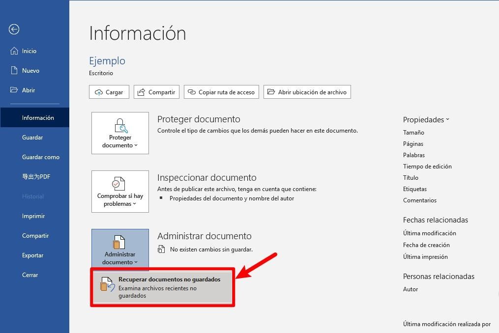 En el caso de que no hayas guardado un archivo cuando Microsoft Word se ha borrado, es posible que puedas recuperarlo. Dirígete a Archivo y luego haz clic en Información, y después a Administrar documento y, por último, haz clic en Documentos recuperados no guardados. Entonces podrás seleccionar el archivo desde el explorador y hacer clic en Abrir. Asegúrate de hacer clic en Guardar como en el aviso que aparece en la parte superior arriba, para poder guardar el archivo.