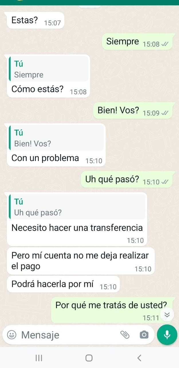 Una de las estafas virtuales más comunes son a través de WhatsApp. Los estafadores pueden conseguir nuestro número de teléfono de otro lugar y luego se contactan con la víctima inventando una historia como en los siguientes testimonios: