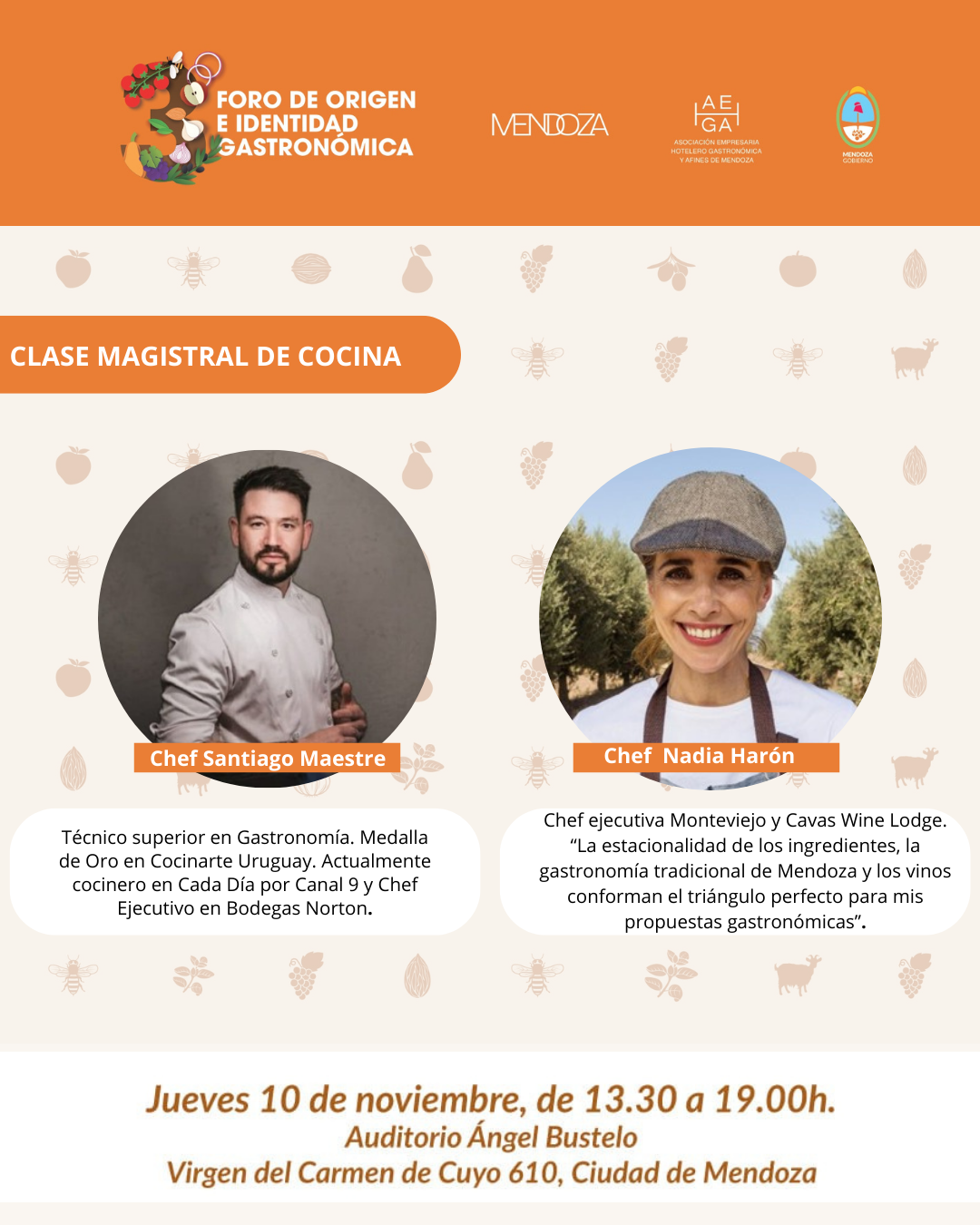 Los presentes podrán deleitarse de una interesante clase de cocina junto a los chefs Santiago Maestre y Nadia Harón, quienes pondrán en prevalencia la identidad, la fusión con las diferentes corrientes migratorias, la estacionalidad y la inmensa variedad de productos autóctonos de los distintos departamentos de Mendoza.