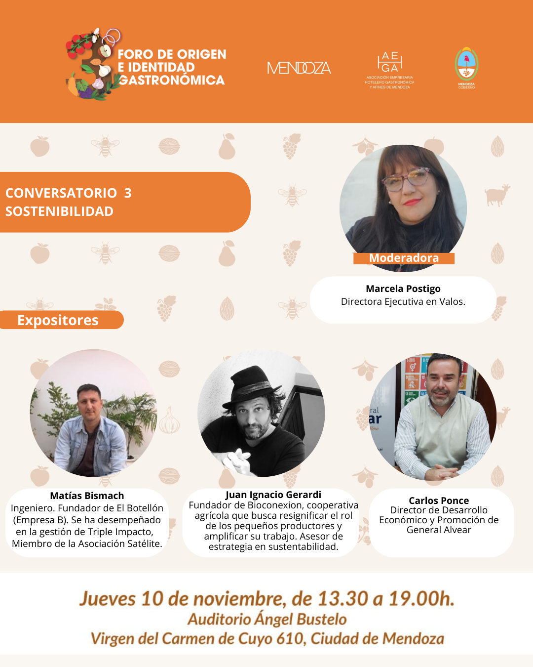 Por último, el conversatorio de Sostenibilidad estará integrado por Matías Bismach, empresario y miembro de la Asociación Satélite; Juan Ignacio Gerardi, fundador de Bioconexión, cooperativa agrícola que busca resignificar el rol de los pequeños productores y amplificar su trabajo; y Carlos Ponce, director de Desarrollo Económico y Promoción de General Alvear, cuya charla será moderada por Marcela Postigo Directora Ejecutiva de Valos.