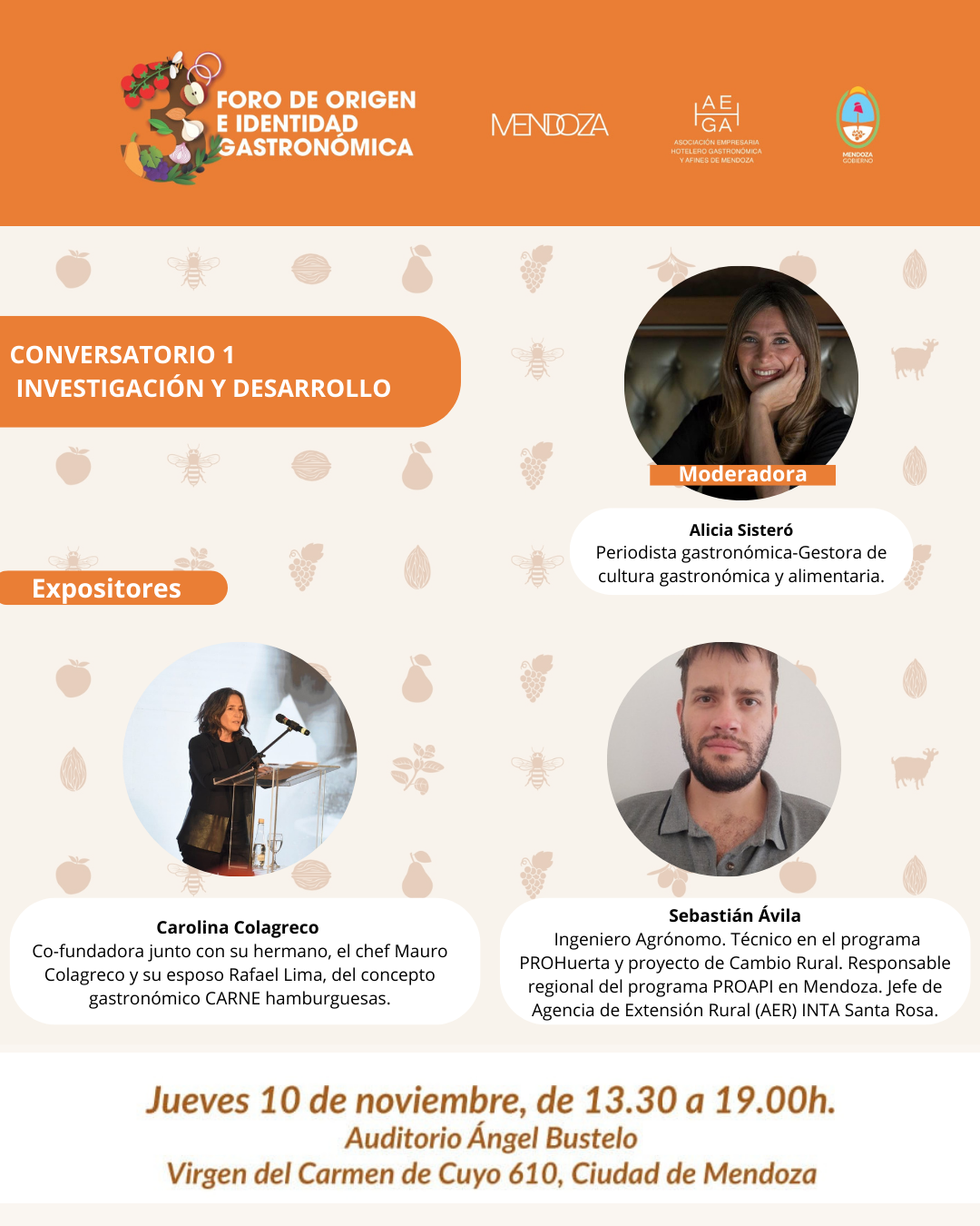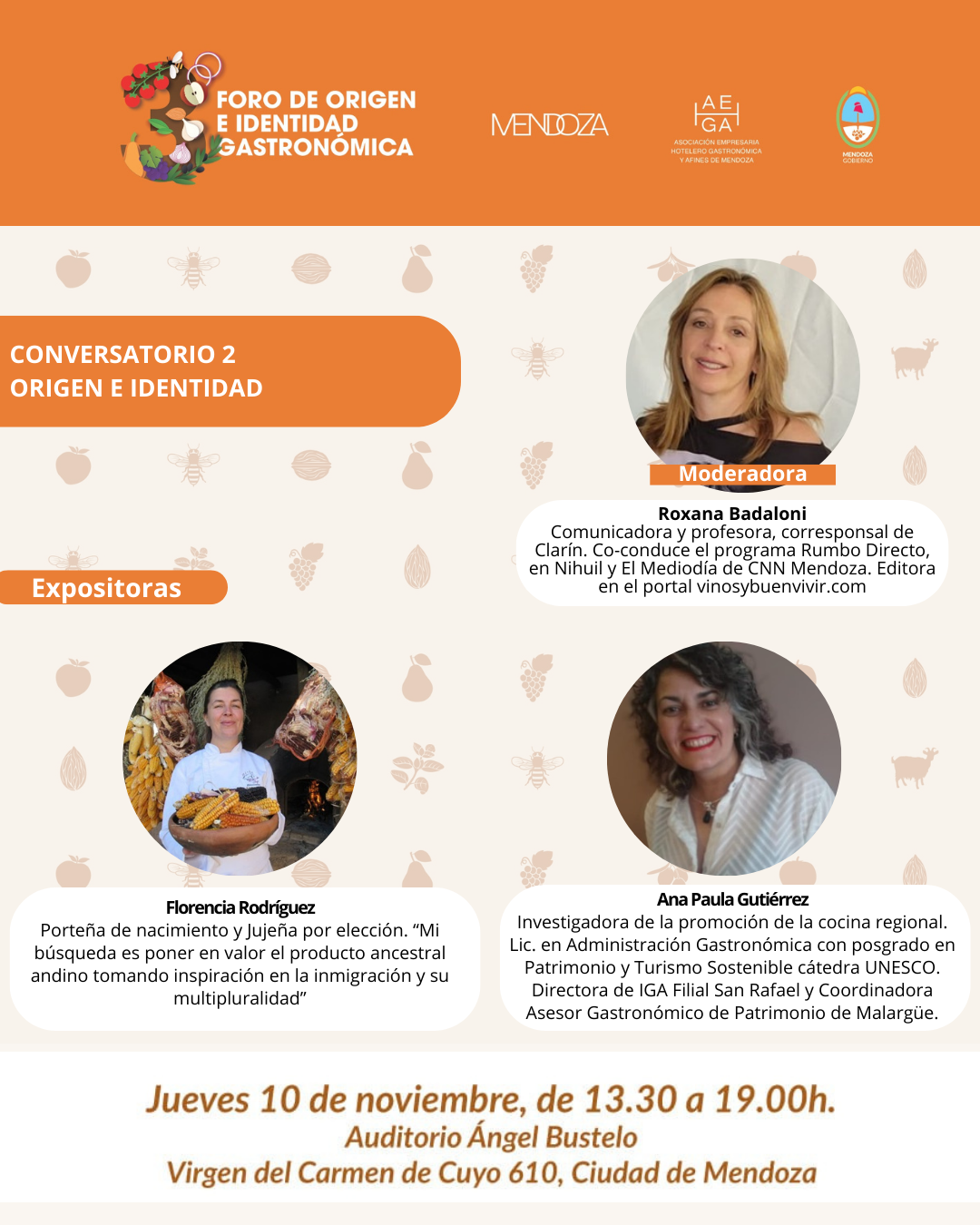 En tanto, el conversatorio de Origen e Identidad estará compuesto por la disertante Florencia Rodríguez, chef Jujeña que trabaja en la puesta en valor del producto ancestral andino, y Ana Paula Gutiérrez, chef licenciada en administración gastronómica con un posgrado en patrimonio y turismo sostenible, esta exposición es moderada por la comunicadora Roxana Badaloni.