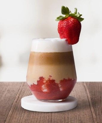Modo de preparación: primero vertemos el puré de fresa en un vaso, luego agregamos el sirope de vainilla y mezclamos toda la preparación. A continuación, agregamos el hielo y la leche que se han enfriado y espumado. Con el dorso de una cuchara, echamos lentamente el café expreso frío en la bebida para la siguiente capa. Para terminar, agregamos una fresa y un poco de espuma de leche en la parte superior de la bebida como decoración.