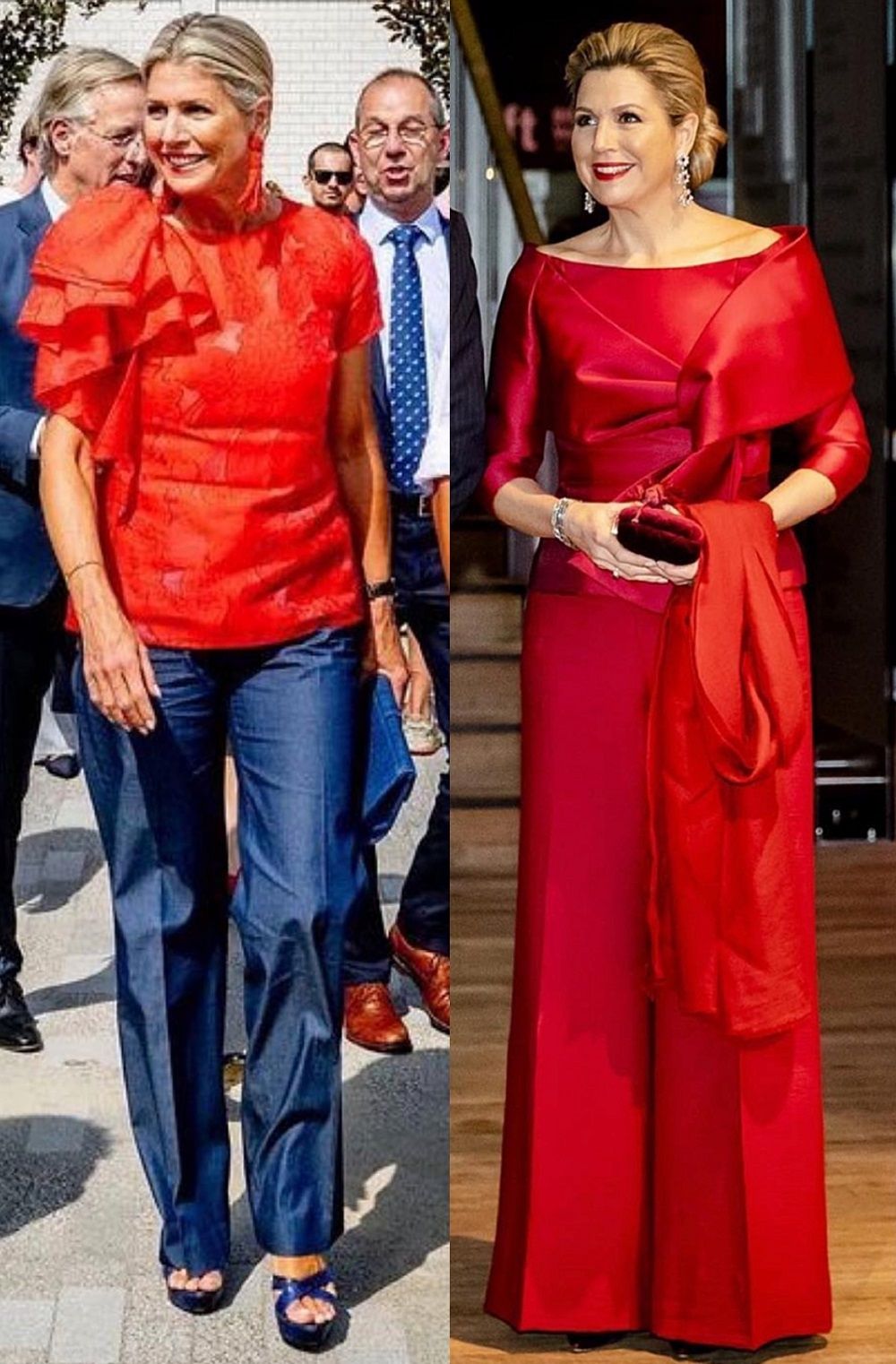 Y el segundo punto en lo que Máxima de los Países Bajos es un faro de la moda, es cómo los combina con blazer, con blusas con detalles de moños, de hombros al desnudo, con corte asimétricos, con mangas importantes o con camisas simples pero potenciadas por broches importantes sean de piedras verdaderas o fake gems, y también de diseño étnico.
