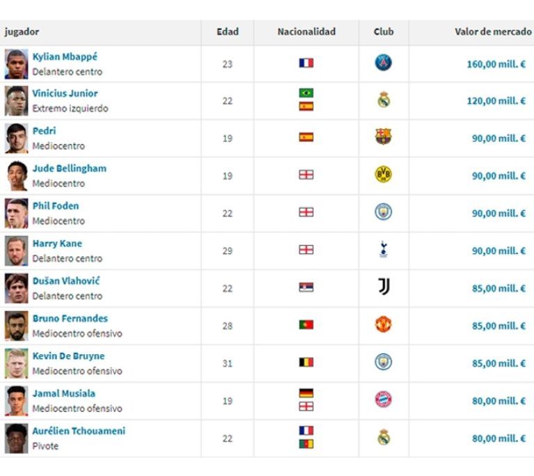 El delantero ostenta un valor de nada más ni nada menos que 160 millones de euros, ¡y qué fortuna! Con solo 23 años es el líder en cuanto a precio de mercado pasando, por lejos, a Lionel Messi y Cristiano Ronaldo.