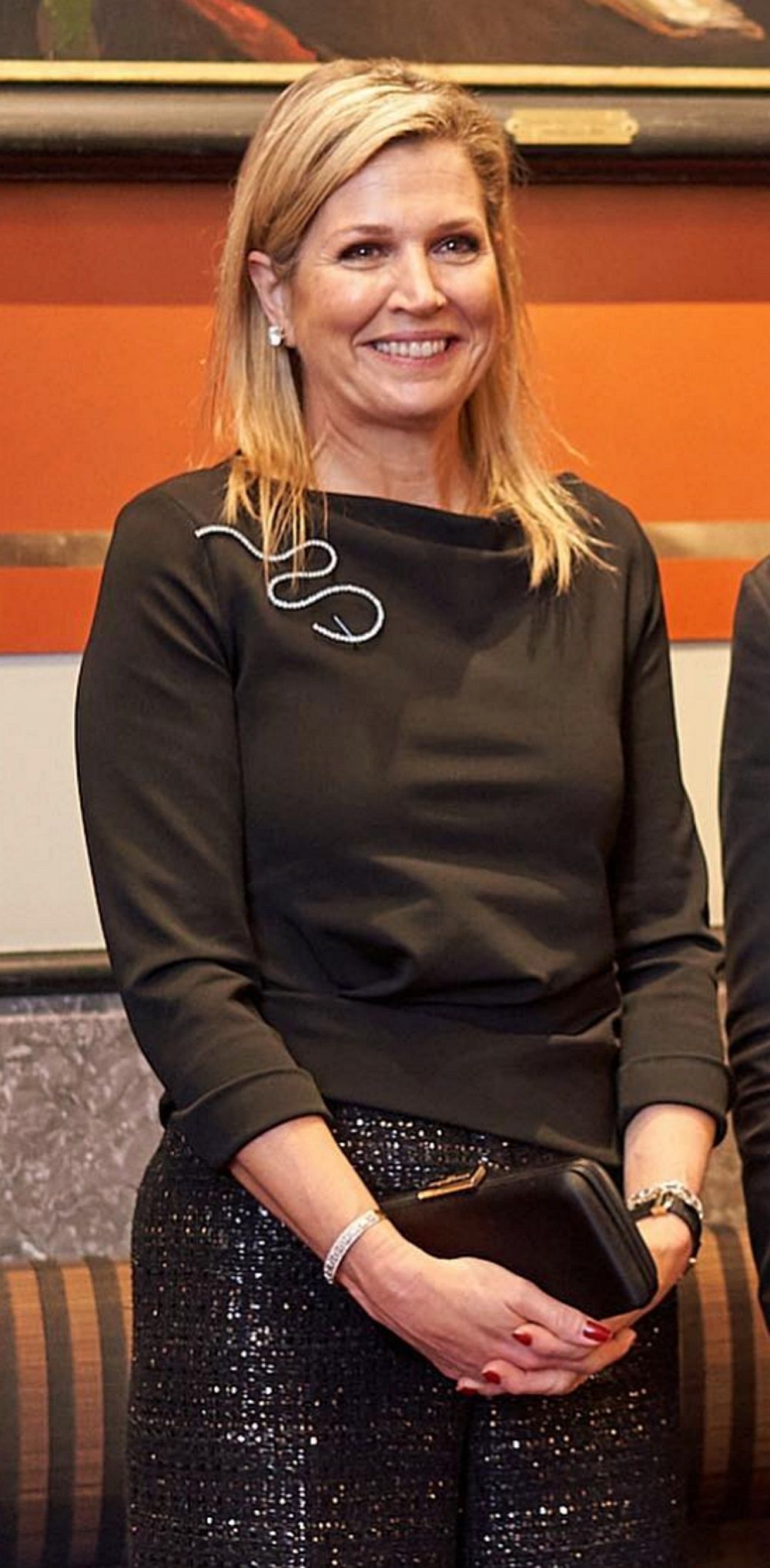 Con ese simple detalle ubicado sobre la parte superior derecha de su blusa, Máxima de los Países Bajos cerró el efecto visual que ella creó con un outfit total black compuesto por unos pantallas de un brillo no exagerado, un clásico foulard envolvente, zapatos italianos –¡divinos!– de Aquazzura, y un clutch de una de las marcas de accesorios favoritos de Máxima de los Países Bajos, Gianvito Rossi.