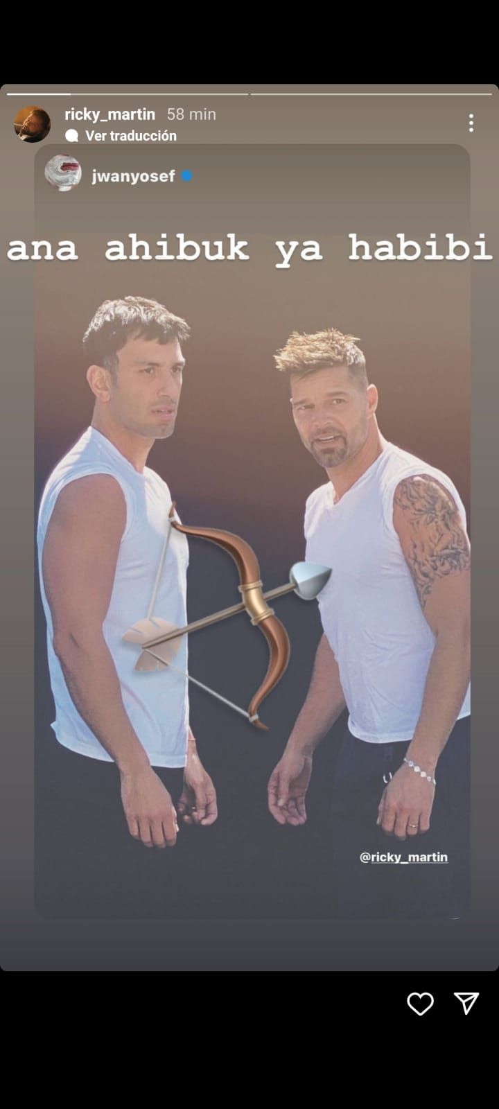 “Ana ahibuk ya habibi” Se lee en uno de los últimos posteos en los que se ve una foto de la pareja, ambos en musculosa blanca, con una flecha de cupido que los atraviesa. La frase está en árabe y dice “Te amo mi amor”. Ambos compartieron la misma foto en Instagram, tanto en el feed como en historias. Y en la publicación Ricky además el agregó “Mi alma”, junto a un emoji corazón. Su marido Jwan Josef le respondió “I love to love ( en español Amo amar)” y un emoji de la flecha de cupido.