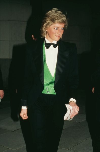 Quién podría imaginar, en ese entonces, que Lady Di iba a dejar los vestidos lujosos a un costado para llevar ropa que era considerada "de hombre". En otra ocasión, hizo una elección parecida, pero en vez de un traje lució un esmoquin de Catherine Walker, una de sus diseñadoras preferidas, con un chaleco de color verde que combinó con un moño negro.