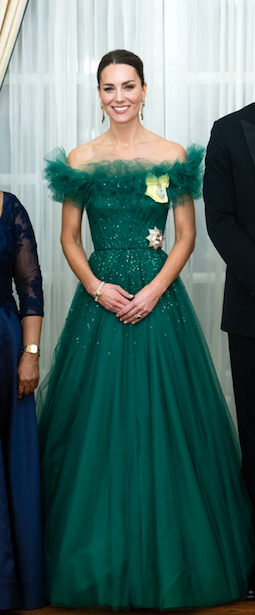 La duquesa de Cambridge se vistió de reina para la cena de gala con el Gobernador General de Jamaica en la que deslumbró con un sensacional y romántico vestido de tul verde esmeralda con lentejuelas de Jenny Packham.