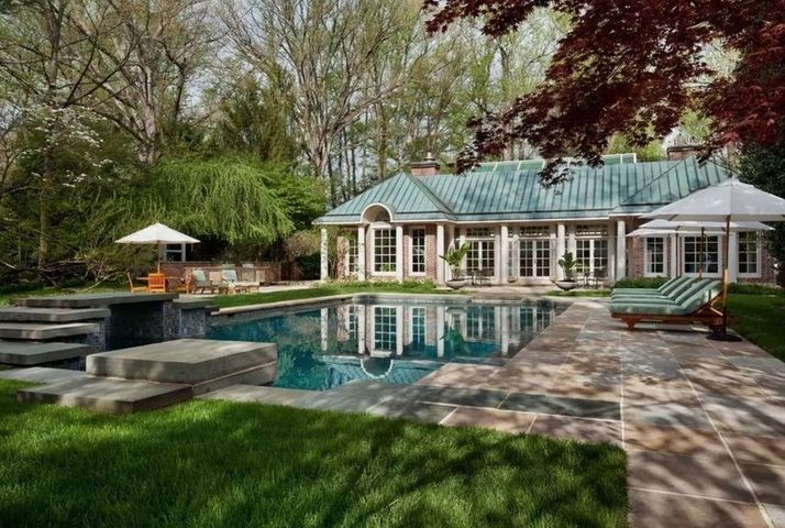 Pérgola, reposeras con colchoneta incorporada y sector para las barbacoas rodean la piscina externa en tonos verde agua marina, a juego con el verano y el tiempo de ocio. La pileta se encuentra luego de atravesar unas escalinatas camino al inmneso parque poblado de árboles especialmente elegidos por la madre de Jackie Kennedy, la socialité Janet Lee Bouvier.