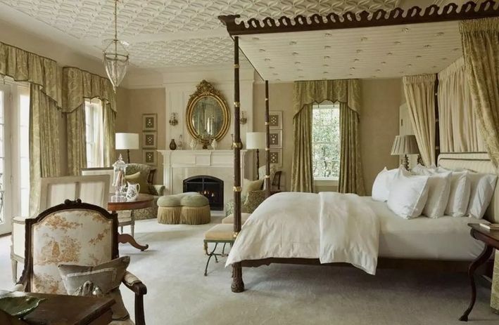La alcoba principal con muebles clásicos de madera de cedro incluye una cama matrimonial con dosel tallado, muebles tapizados con brocato y cortinas de terciopelo.