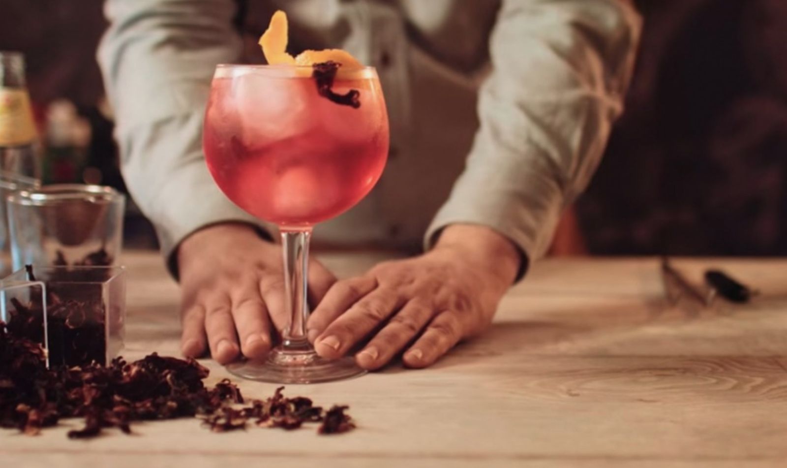 Empieza por agregar unas flores de Jamaica a la copa fría, para luego sumar las 3 onzas de ginebra. Agita la copa y muele ligeramente las flores dentro de ella con suavidad ¡No vayas a romperla! Para terminar, agrega algunas bayas de enebro.