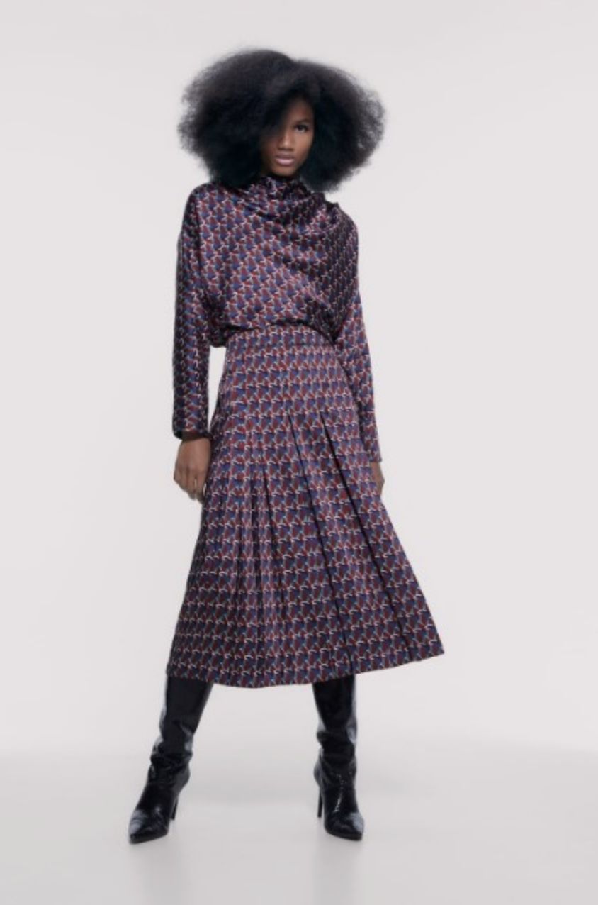 Eso sí, en vez de realizar una pieza entera, Zara lanzó un conjunto que cuenta con dos piezas, una falda midi y una blusa, para que además puedas usarlas por separado con una prenda básica como una blusa blanca o una falda negra.