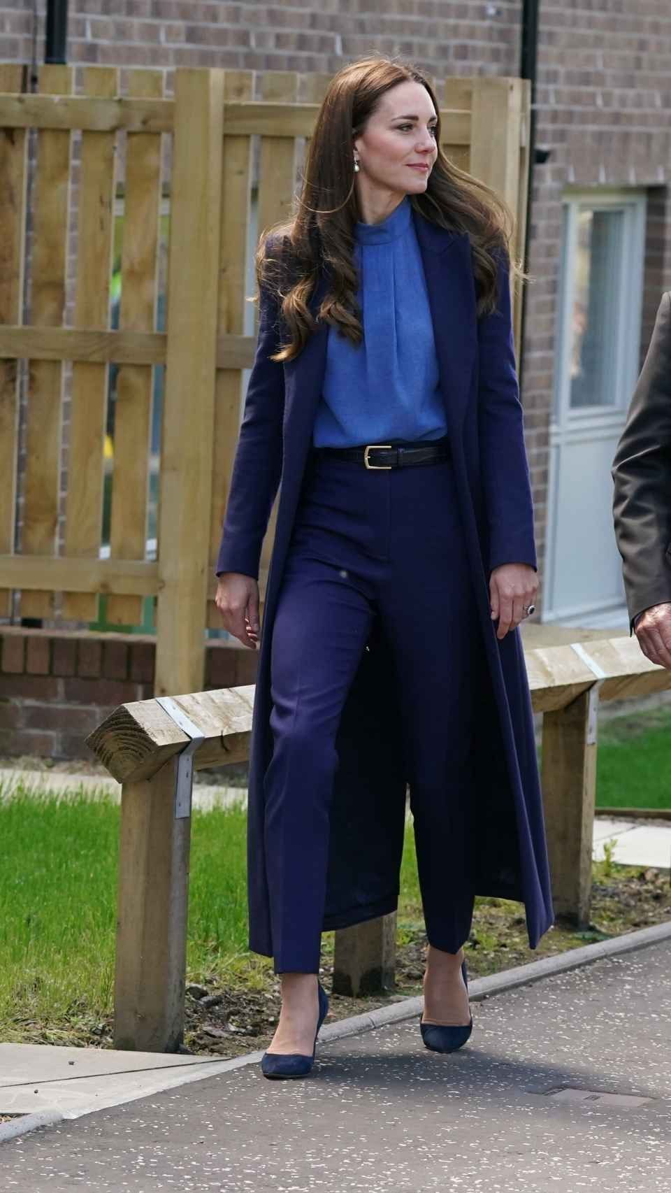 En este caso, la duquesa remató el conjunto con un clásico abrigo largo de Catherine Walker de corte masculino, en el mismo tono y con el que completaba un juego cromático perfecto junto al príncipe Guillermo.