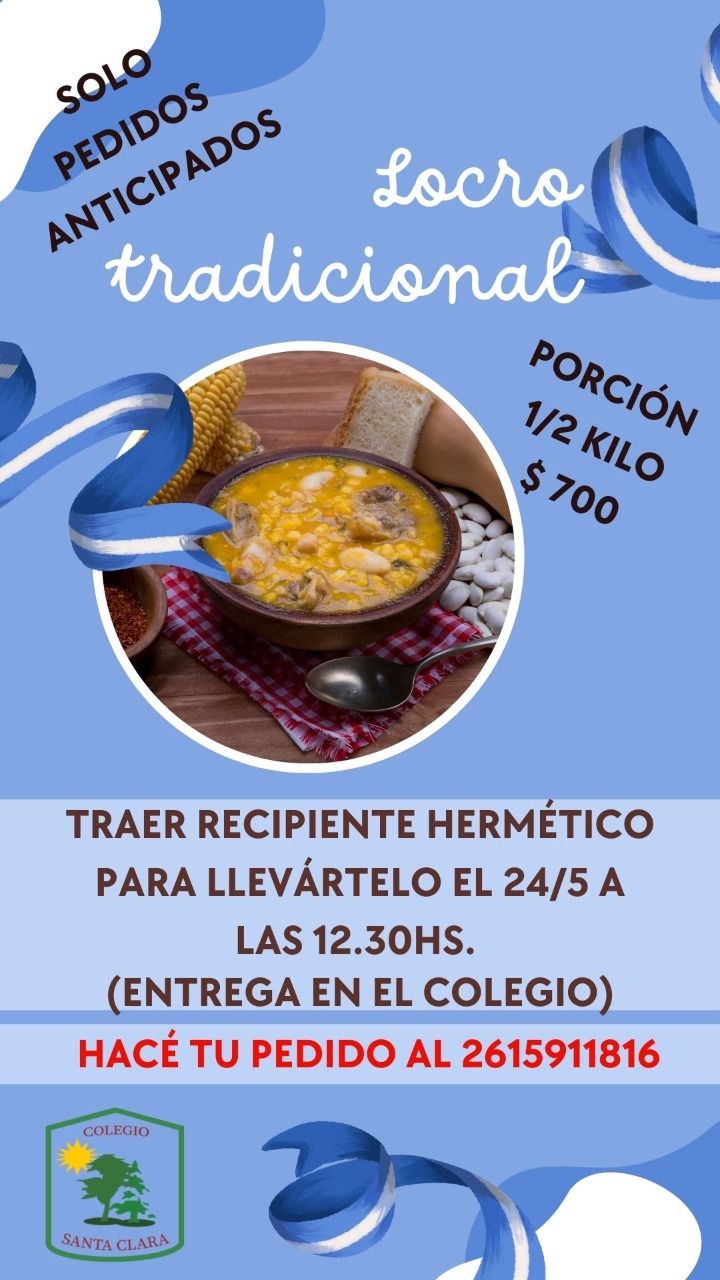 Los alumnos del Colegio Santa Clara estarán vendiendo locro para juntar dinero y así poder hacer diferentes viajes. La propuesta es la siguiente: