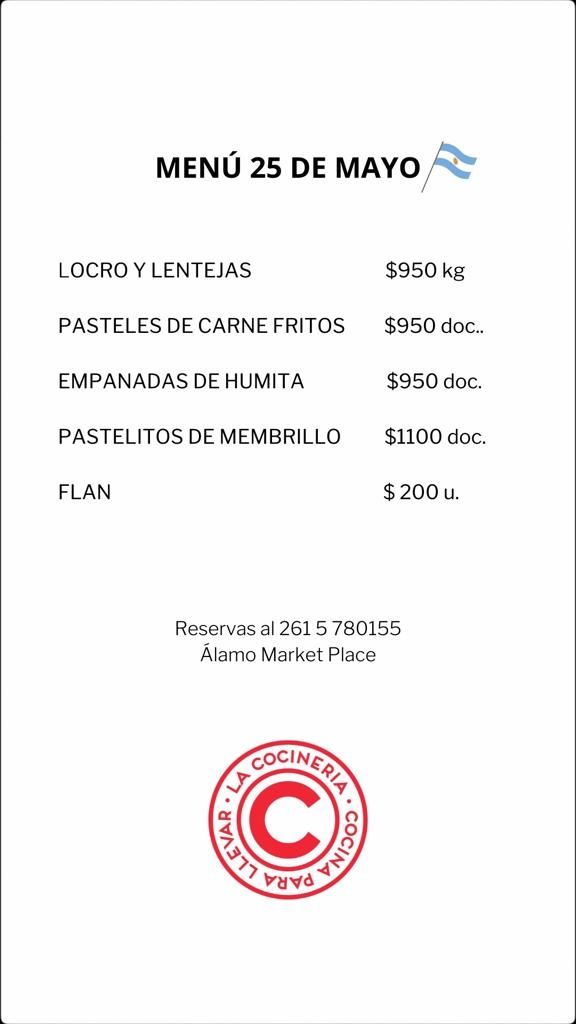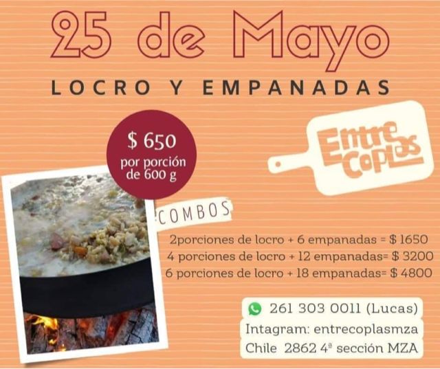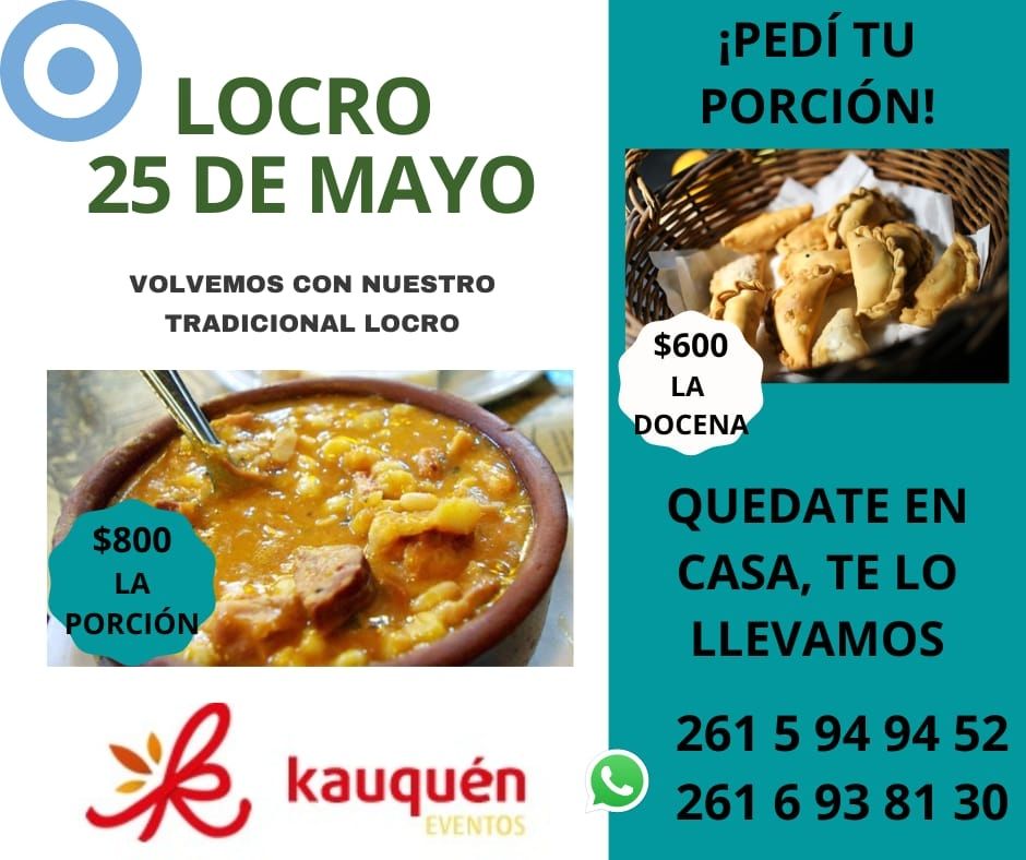 El 24 de mayo, en "Kilo", ubicado en Paso de los Andes 2908 de la Sexta Sección, venderán locro. Se trata de un local especializado en comidas caseras para llevar El kilo costará $1200 y el horario de atención es de 12 a 15 horas. Los pedidos se hacen a los teléfonos 4203214 o al 152590718.