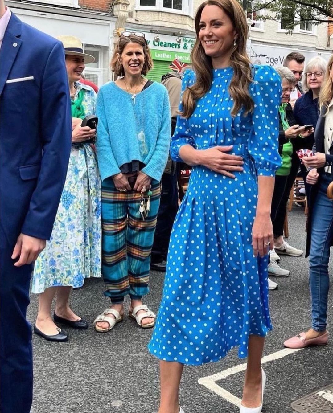 Y además de vestirse con prendas sofisticadas para los actos principales, también apostó a piezas más informales, como el vestido de base azul de lunares blancos firmado por Alessandra Rich que usó para interactuar con la gente en las calles de Londres.