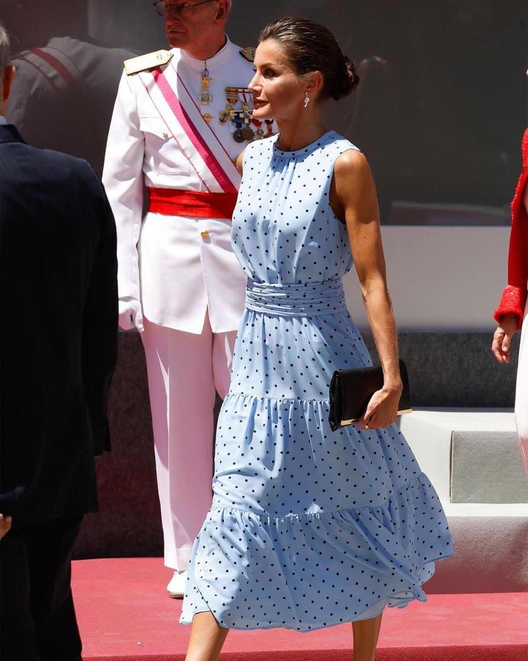 A su vestido de falda midi con fruncidos, sin mangas, con cuello redondo y ajustado en la cintura con un fajín en el mismo tejido, lo combinó con una cartera de Carolina Herrera y zapato negros con tacón y destalonado. Un estilismo ligero y elegantísimo a través del cual Letizia Ortiz consagró al polka dots como uno de los ítems de moda de la temporada.