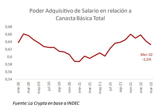 Natalia Motyl, economista jefe de La Crypta, explica “más allá de que en alguno de los meses puede ser que el poder adquisitivo de los salarios haya mejorado; lo cierto es que la corrosión que han sufrido los salarios por la aceleración de la inflación fue catastrófica. Es más, desde que comenzó el año el salario ha perdido poder de compra con respecto a la CBT en un 2,7% y en 5,3% con respecto a la CBA. Podemos aventurarnos que en el primer trimestre del año se han incrementado tanto la cantidad de pobres como de indigentes.”